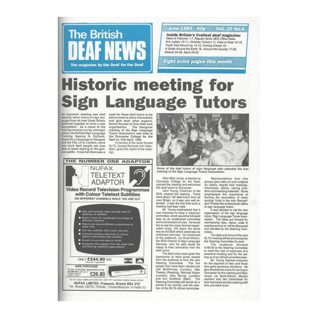 19 April 1989In April 1989, Liz Scott-Gibson, the British Deaf Association’s Education Officer, played a key role in establishing the Sign Language Tutors Association (SLTA). An open meeting at Doncaster College laid the groundwork for a collective of BSL tutors to collaborate and support one another.