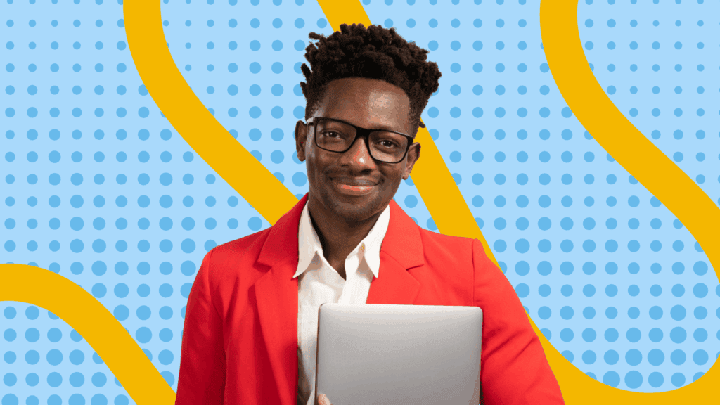 Black male teacher holding a tablet, with 'Upgrade' written in the background